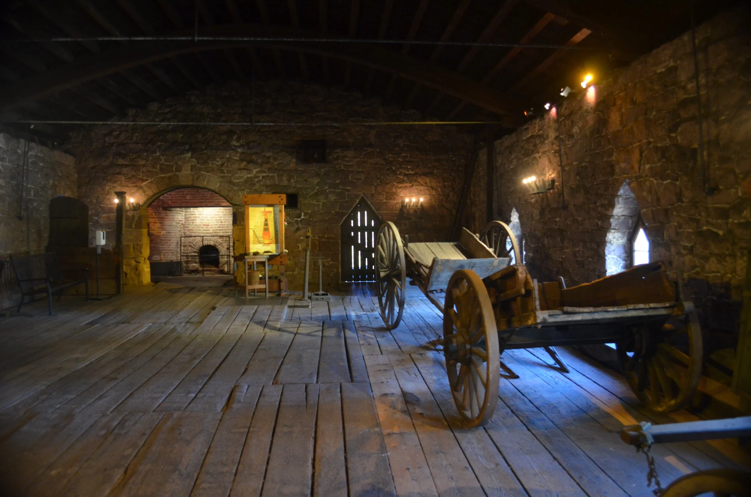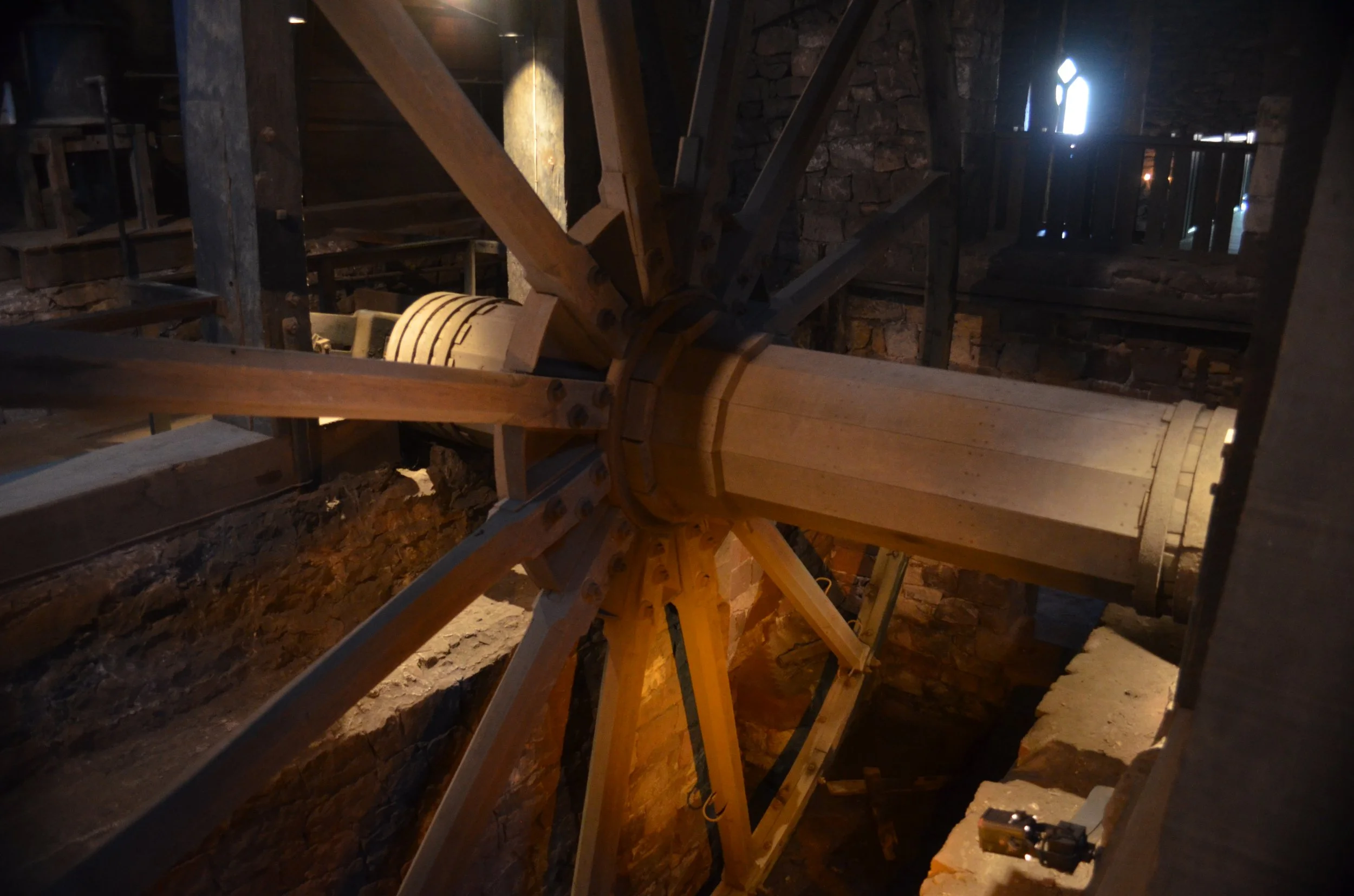 Next, watching our step in the dim lighting, we descended a wooden staircase to see the Great Wheel. Looking up, we could see the enormous timbers supporting the ceiling and the charging room above us.