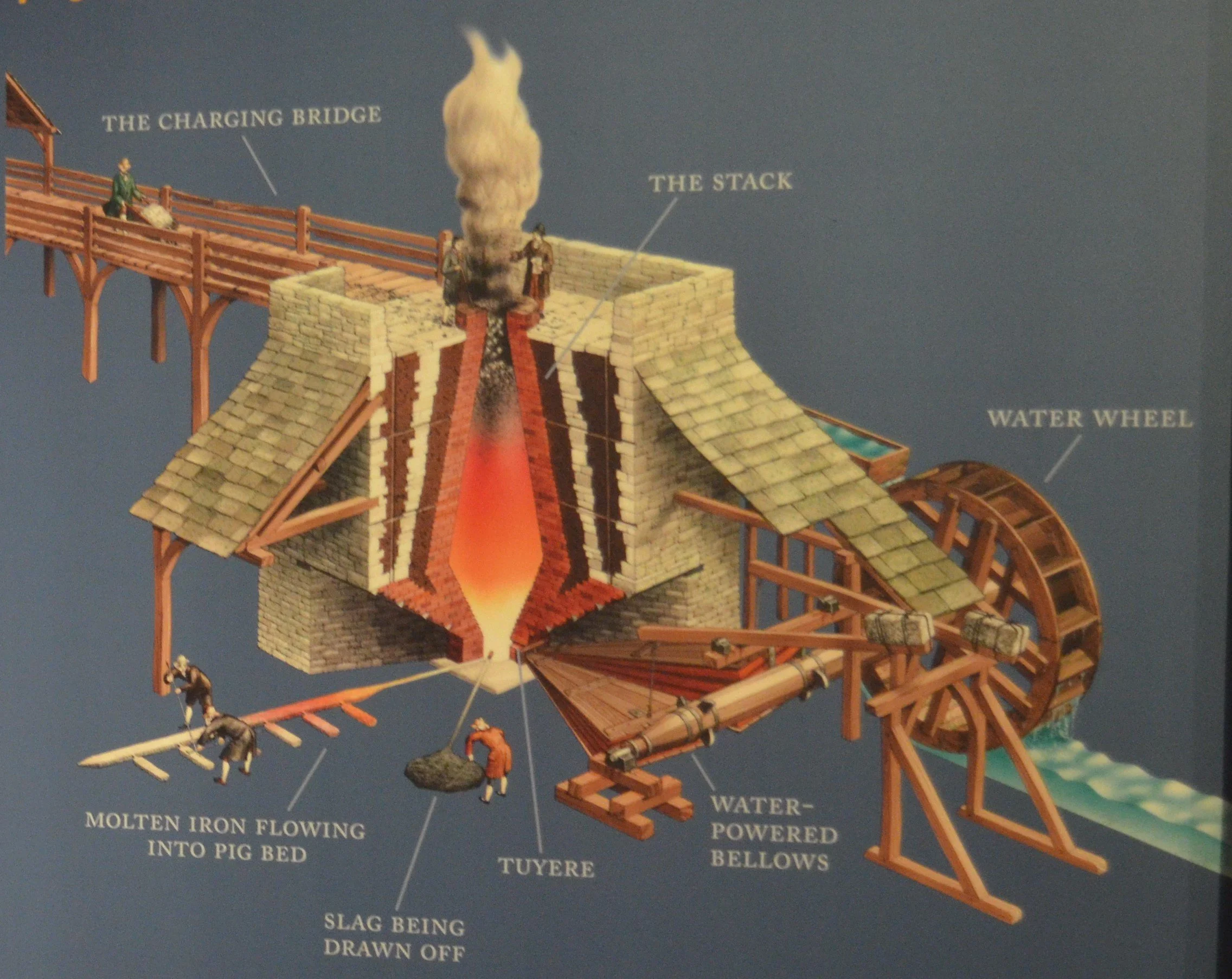 In the charging room, wagon loads of local iron ore, limestone, and charcoal from nearby woods were dumped into the furnace, like feeding the mouth of the beast.